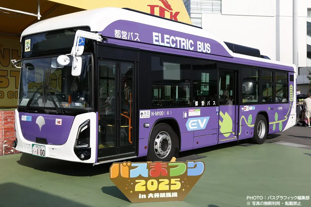 会場で度肝(どぎも)を抜いた出展車が、都営バス北自動車営業所へ2025年に2台導入されたBEV(Battery Electric Vehicle:バッテリー式電気自動車)フルフラット路線バスのいすゞエルガEVです。