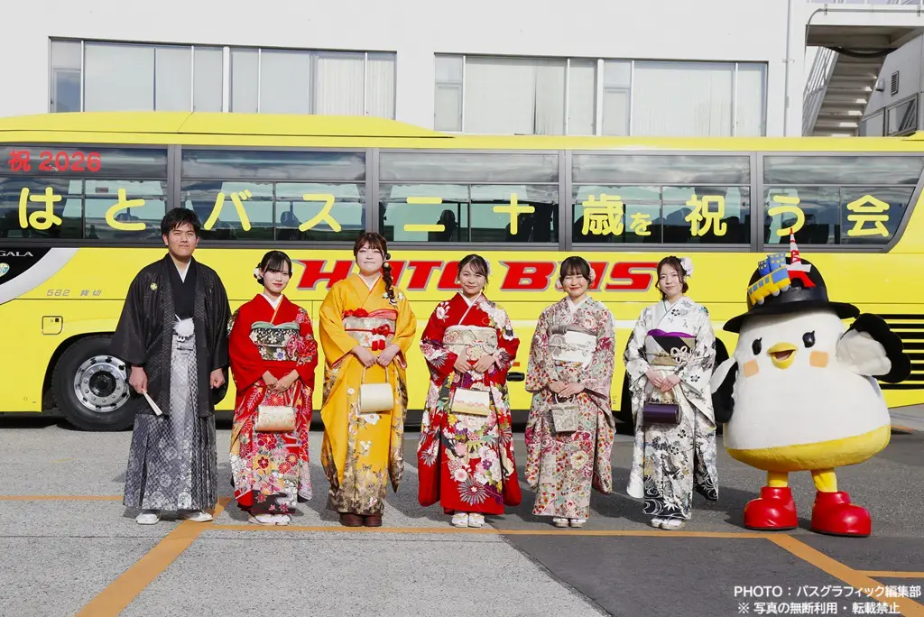 6人は居並ぶ報道陣に少し照れたような表情を見せながらも、側窓に「祝 2026 はとバス二十歳を祝う会」の文字が入れられたバスの前で、役員やはとバス公式キャラクター「しゃぽぽ」と一緒に記念写真撮影に臨みました。
