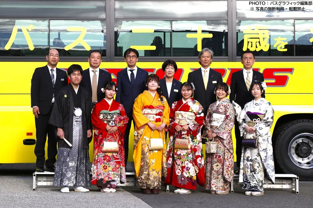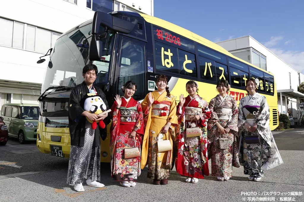 2026年1月6日午前10時前、本社車庫の詰所(つめしょ)から晴れ着に身を包んだ笑顔いっぱいの二十歳の6人が現れました。