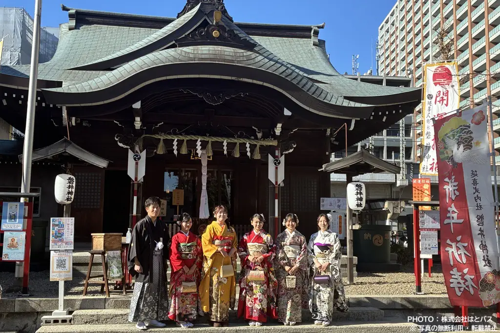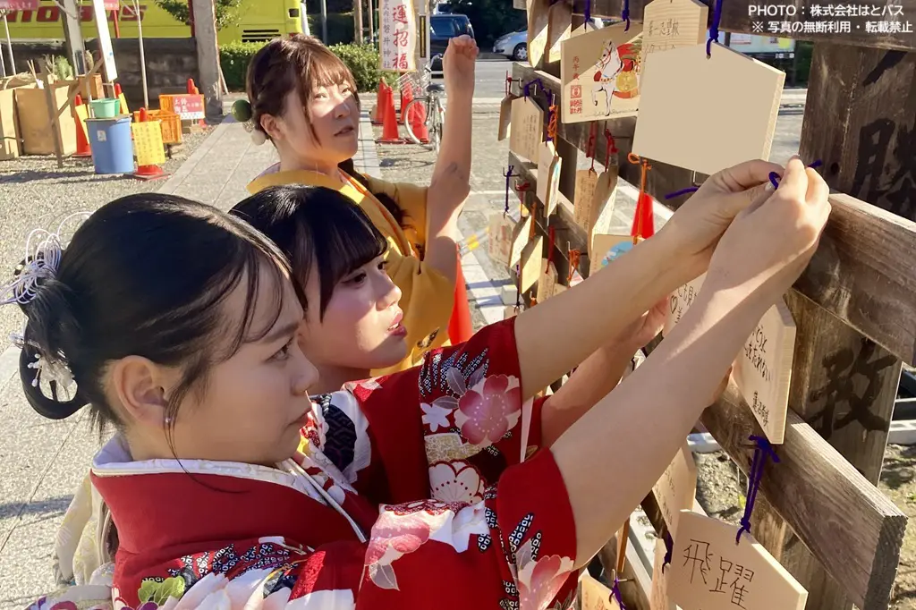 2022年までの「はとバス成人式」では明治神宮への参拝と絵馬(えま)の奉納(ほうのう)を行っていましたが、2023年からの「はとバス二十歳を祝う会」では、京浜急行電鉄大森海岸駅近くにある磐井神社への参拝・奉納となりました。