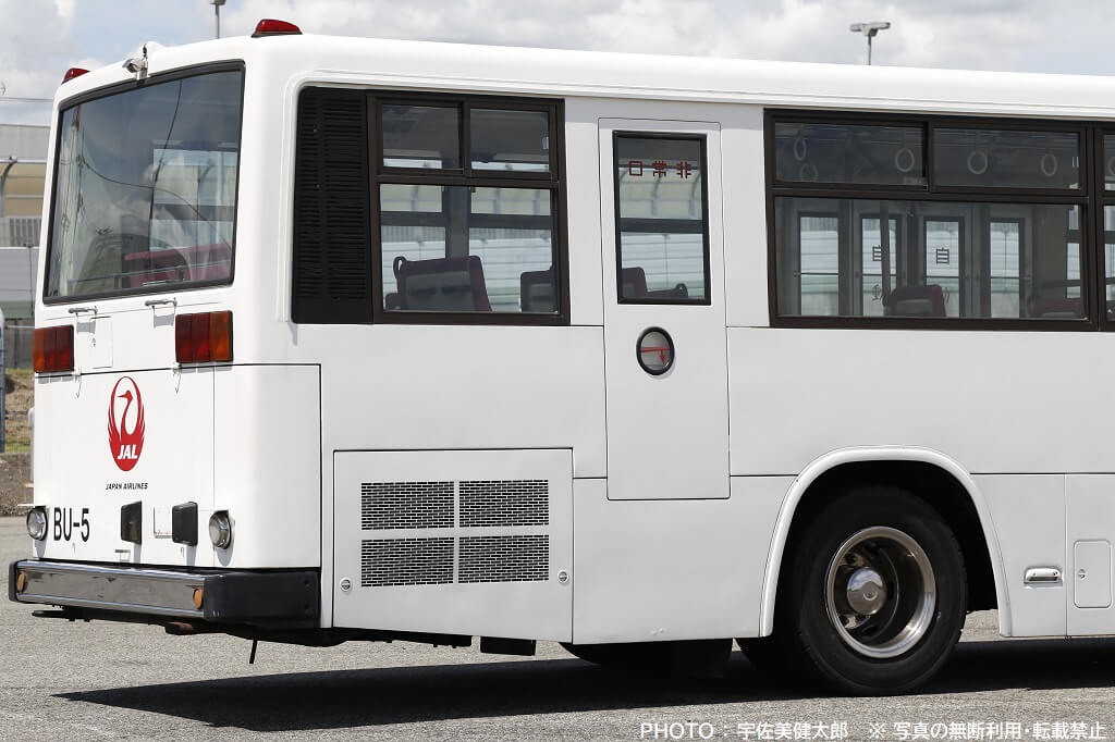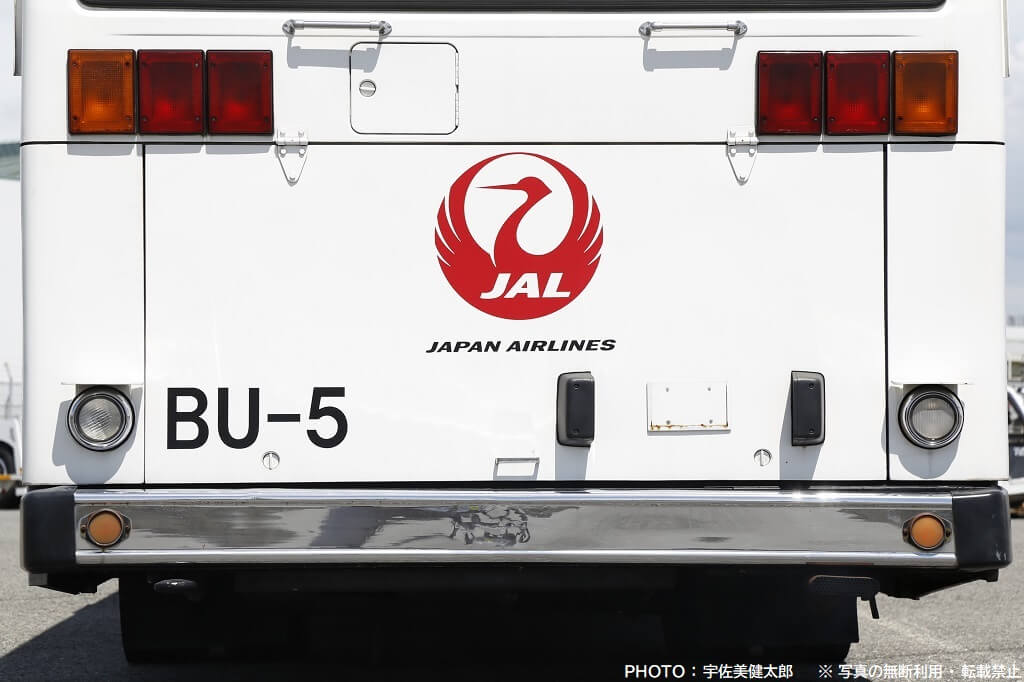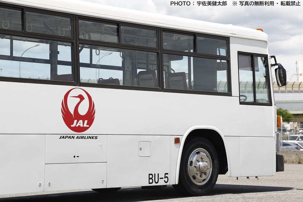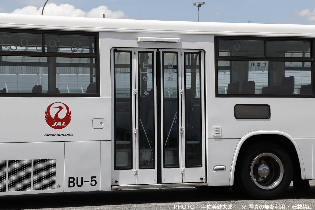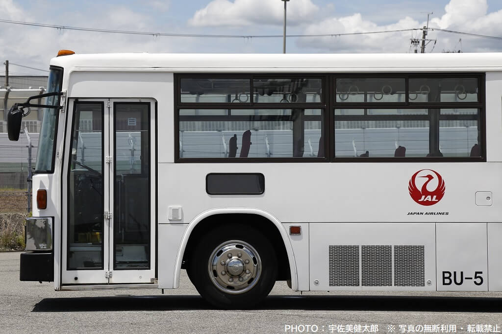 伊丹空港で活躍するJALのランプバスは今回紹介する車両以外も数台あり、この車両とは車種やスタイルが異なりますが、社番(伊丹空港JALランプバスの固有番号)が振られており、この車両は「BU-5」となっていますので、ここから本記事も社番BU-5と記載することにします。
