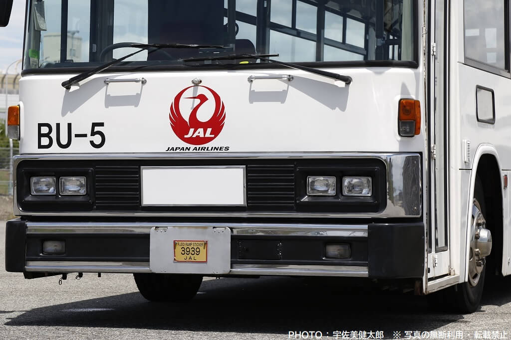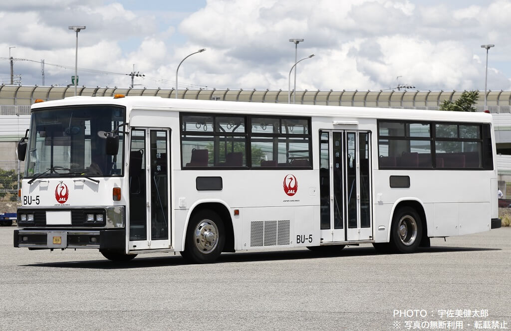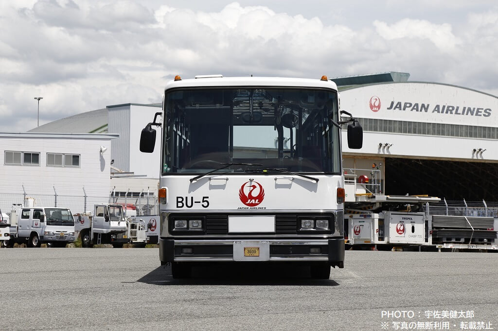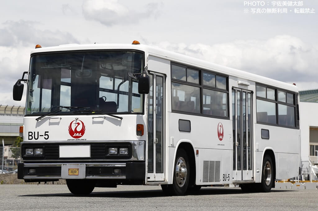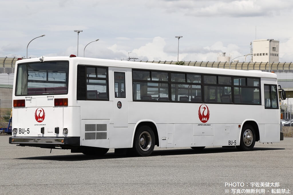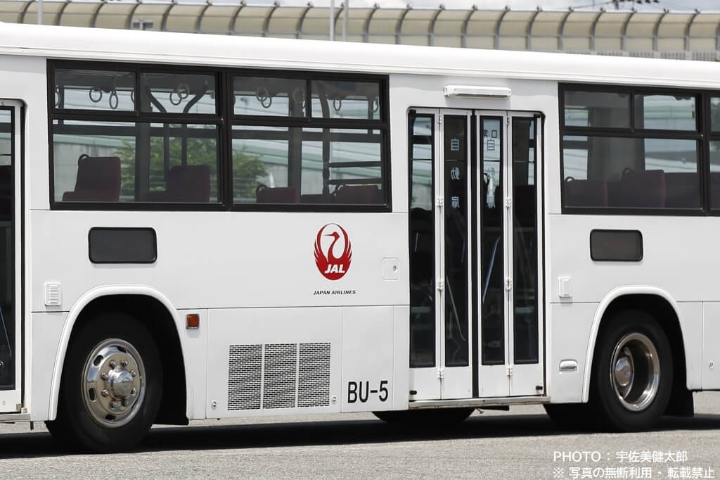 伊丹空港で活躍するJALのランプバスは今回紹介する車両以外も数台あり、この車両とは車種やスタイルが異なりますが、社番(伊丹空港JALランプバスの固有番号)が振られており、この車両は「BU-5」となっていますので、ここから本記事も社番BU-5と記載することにします。