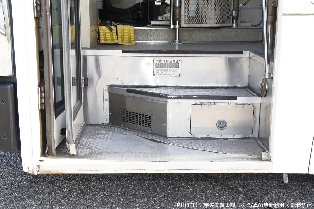 1段目ステップのナナメに切り欠かれた部分の立ち上がりにあるグリルは、寒冷地向けの車両に見られるステップヒーターの吹き出し口で、この車両が当初、新千歳空港のランプバスとして導入された来歴を物語ります。