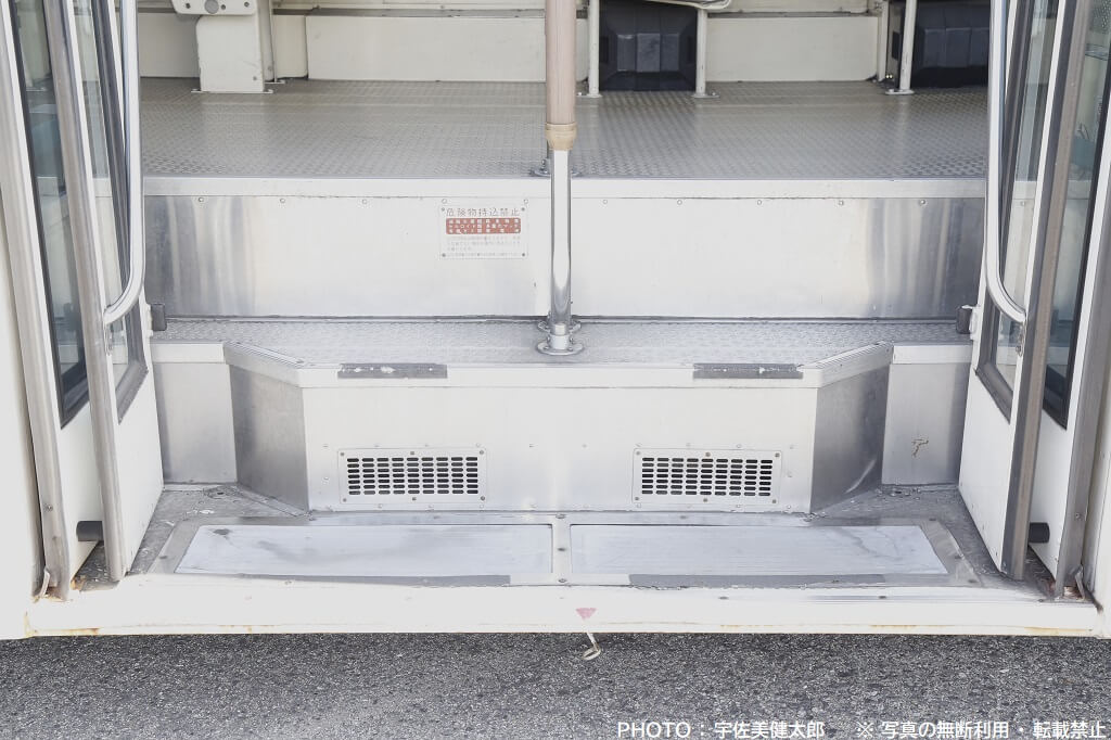 乗車する時、車体に足を掛けてから2段のステップを上がり車内に入る、いわゆる「ツーステップ車」ですが、1段目のステップ高が26.5cmと当時としては低く抑えている低床ツーステップ車になります。