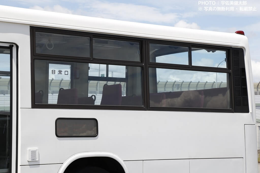 右側面の非常扉から運転席の引き違い窓の間の側窓も逆T窓で、広いピッチの4連タイプとなっています。