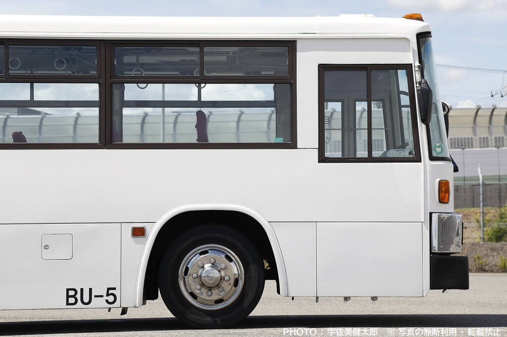 現在の路線バスの側窓では主流となっている逆T窓ですが、社番BU-5が登場した1990年頃の路線バスの側窓は通称「サッシ窓」と呼ばれる上下開閉構造の2段窓が主流で、逆T窓は観光・高速バスや少し豪華な仕様の路線バスでしか採用されていなかったため、特別感がありました。