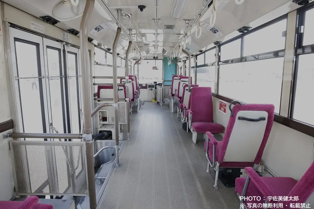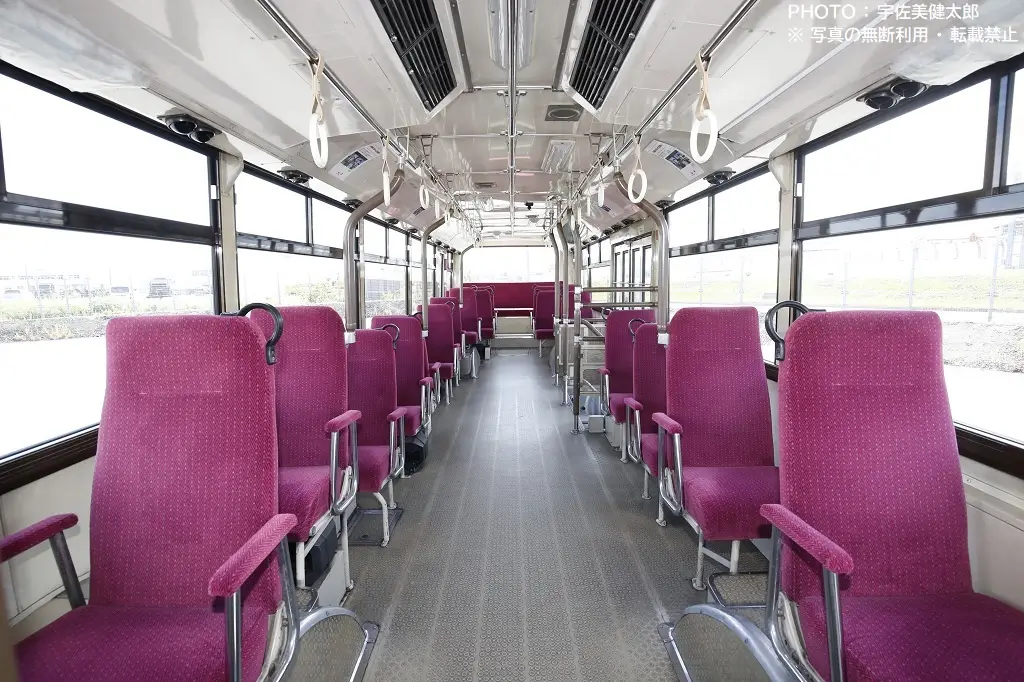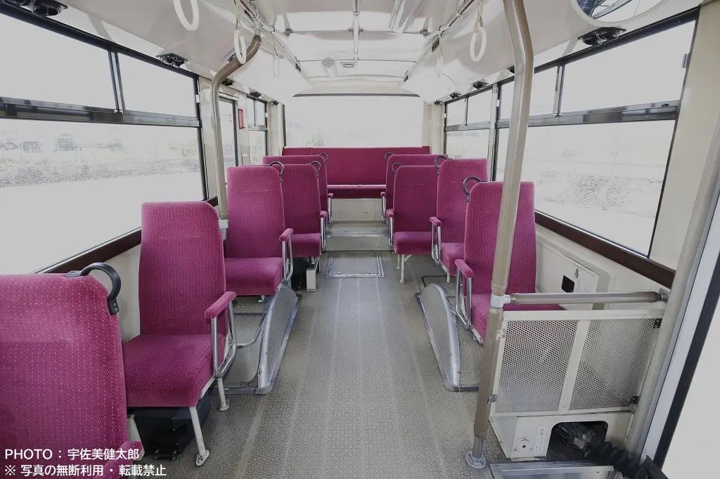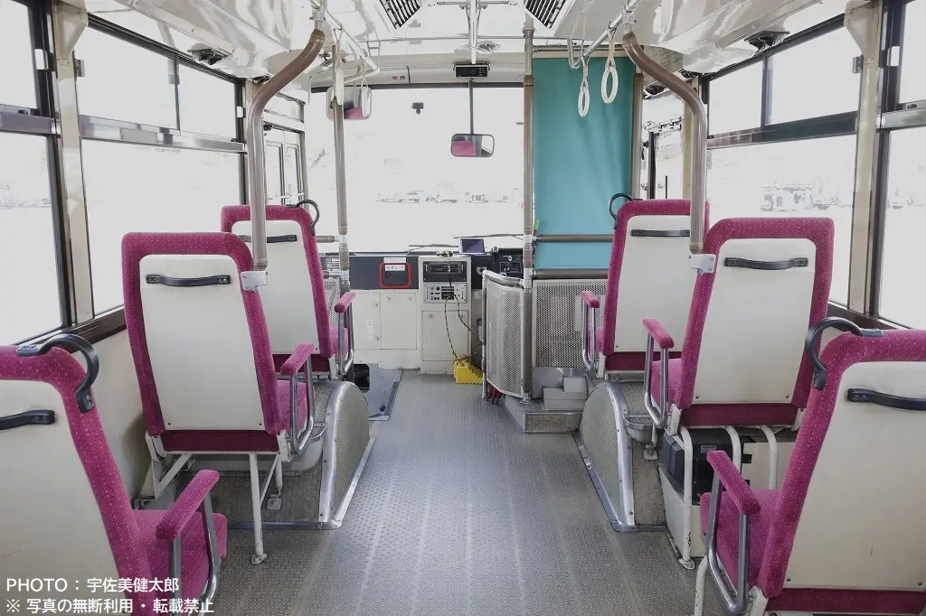 車内後方の座席レイアウトは一般的な大型路線バスのツーステップ車と大差ない印象で、床面は左右後輪タイヤハウス付近を除いて、最後部座席の手前まで通路がフラットになっています。