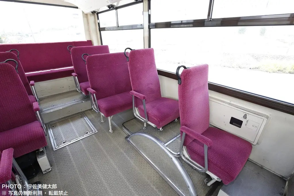 社番BU-5の車内中ほどには、一般的な大型路線バスではまず見掛けないユニークな座席配置が見られます。