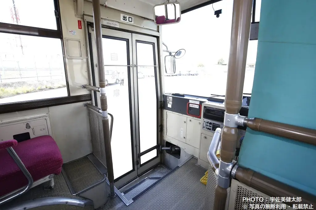 それでは、伊丹空港で活躍しているJALランプバス、1990年式日産ディーゼル工業U-UA440NSNの社番BU-5の車内に、早速前扉から乗り込んでみることにしましょう!