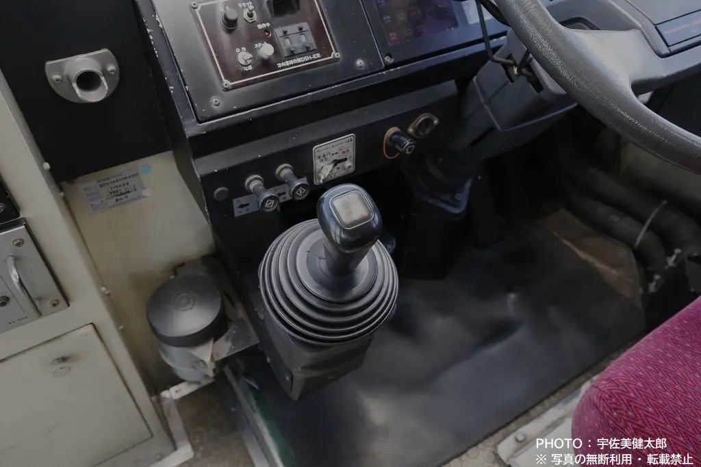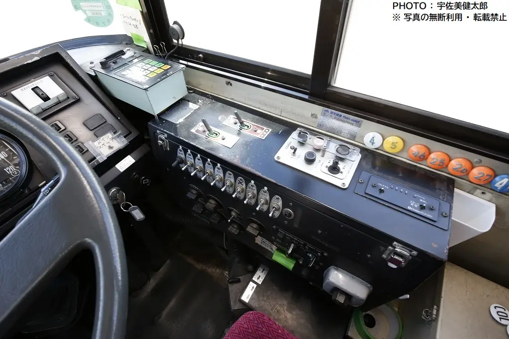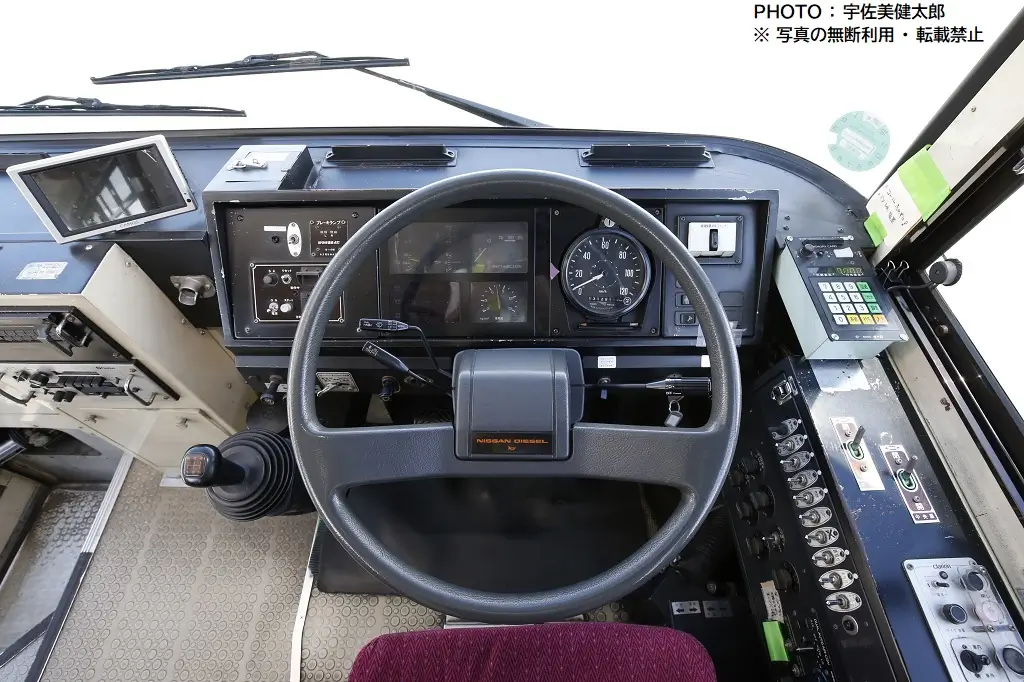 運転席と座席の間は、現在の大型バスと比較すると少し距離が詰まっている印象ですが、まとまり感のあるコックピットと言えます。