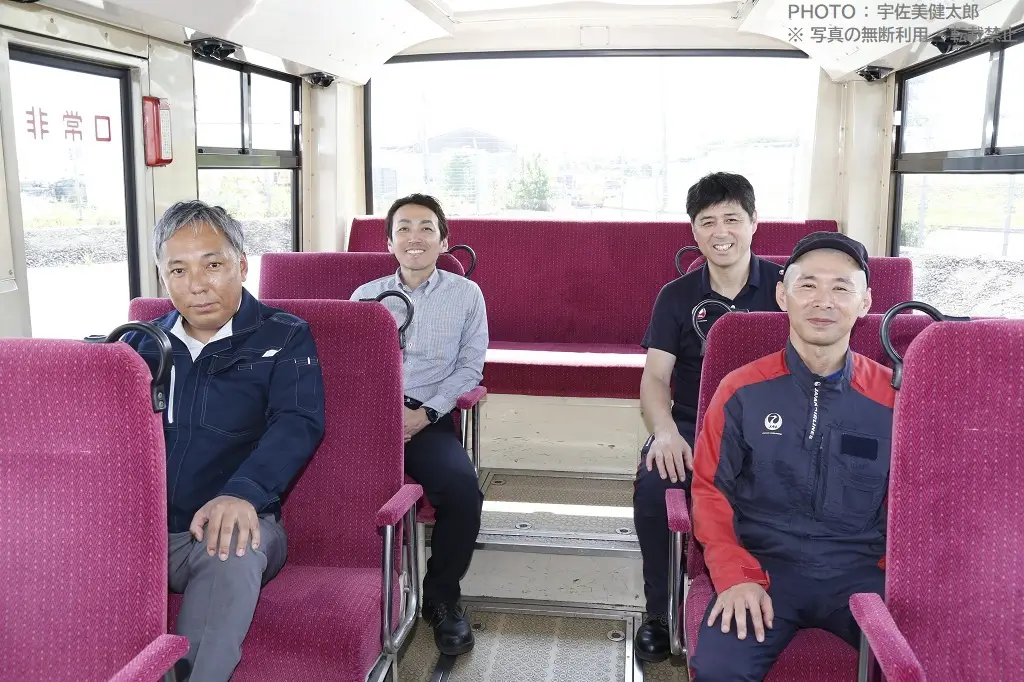 この社番BU-5の整備・管理や運行に携わる方々で、時計回りに、阪急阪神エムテック営業部の井原 繁(いはら・しげる)部長、加治屋自動車の坂本賢太(さかもと・けんた)常務取締役、同社空港部の藤田恒司(ふじた・こうじ)部長、同社空港部送迎グループの西田宏輝(にしだ・ひろき)係長です。