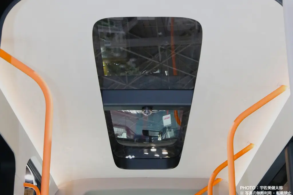 天窓中央のピラーには運行中に乗客の安全や荷物の状況を確認するための車内カメラを取り付けています。
