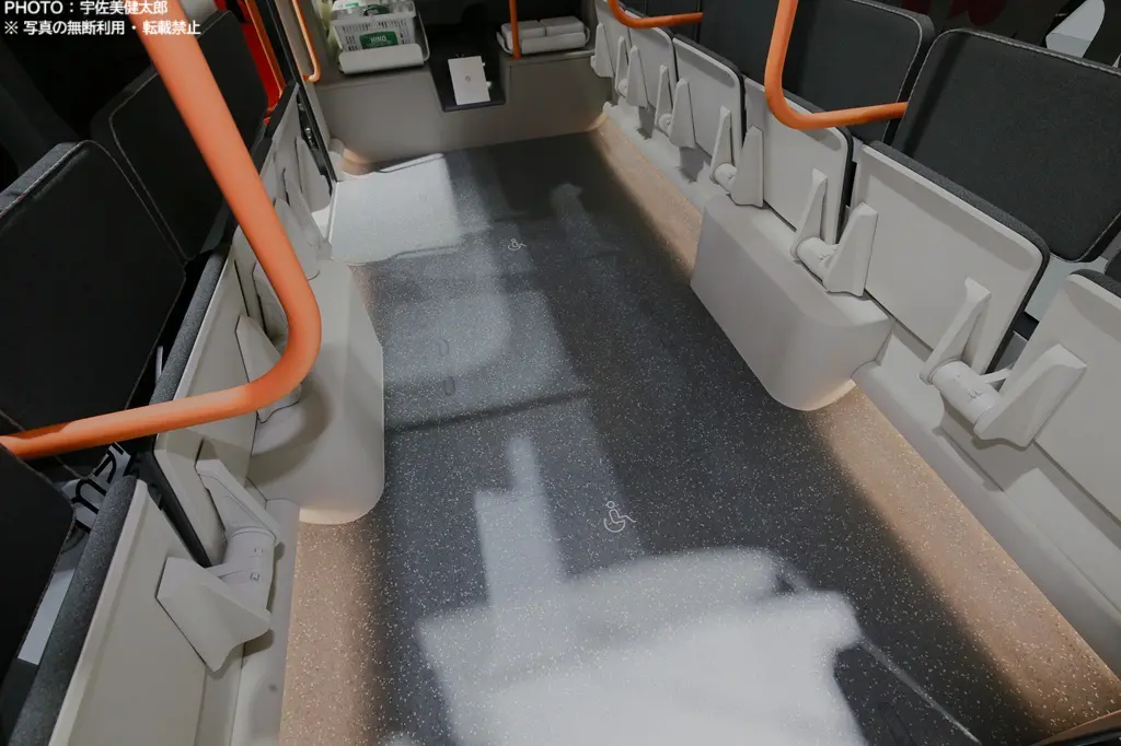 座席レイアウトはいたってシンプルで、運転席側と助手側に両側に横向き座席を設けていて、手スリを備え付けています。