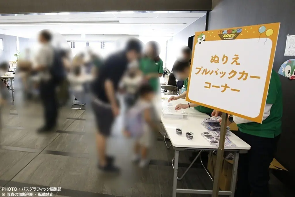 各社局のキャラクターのデザインと「バスまつり2025」のポスターやパンフレットに使われているバスが並んだデザインの2種を配布しており、都営バスのEV(Electric Vehicle:電気自動車)バスのプルバックカーをその場で組み立てることもできました。